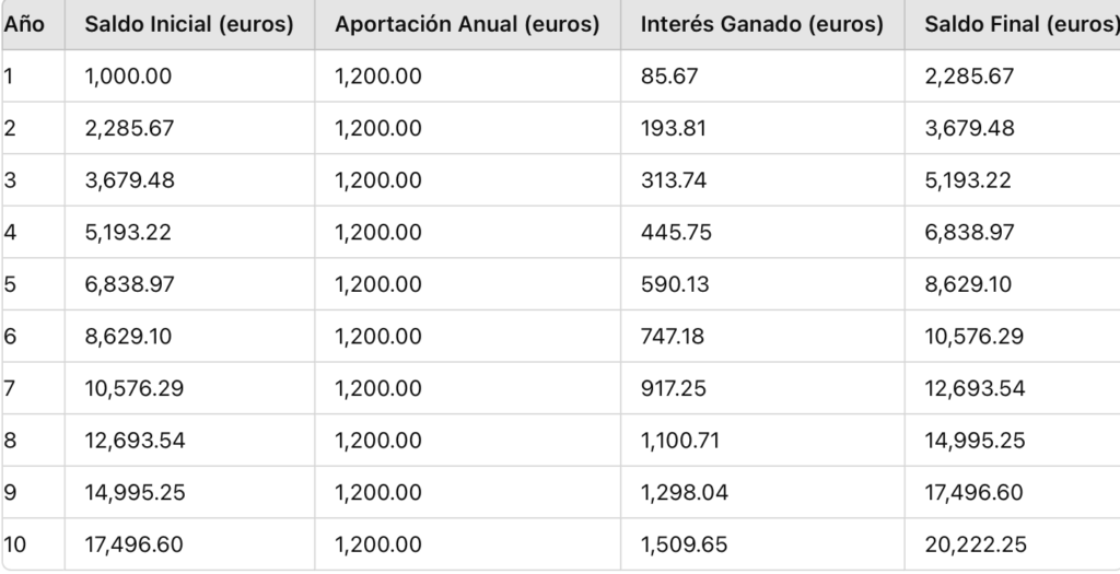 Saldo final: Al final de 10 años, tu inversión inicial de 1,000 euros y las aportaciones mensuales de 100 euros habrán crecido hasta 20,222.25 euros.